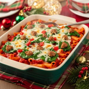 Ingredients: pasta, Italian sausage, marinara, ricotta, mozzarella, spinach.