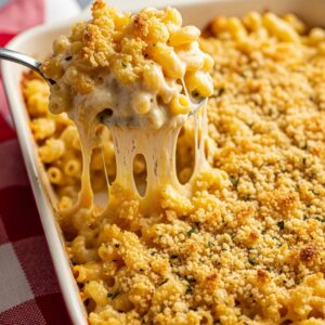 Ingredients: pasta, cheddar, mozzarella, butter, flour, milk, breadcrumbs.