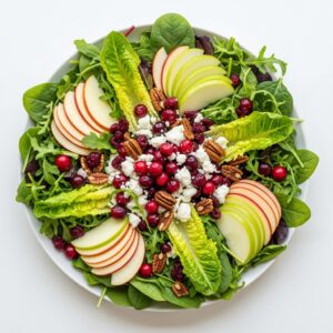 Ingredients: mixed greens, cranberries, pecans, feta, apple slices, vinaigrette.