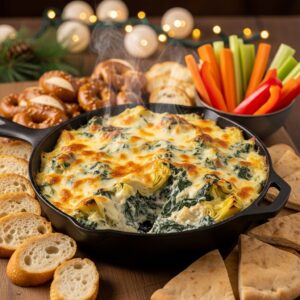Ingredients: spinach, artichokes, cream cheese, mozzarella, parmesan, garlic.