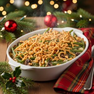 Ingredients: green beans, cream of mushroom, garlic, parmesan, fried onions.