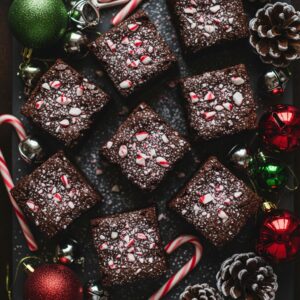 Rich brownies topped with crushed candy canes — a festive treat that’s easy to serve in squares.