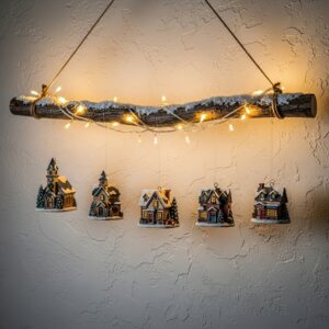 Attach lightweight cardboard or wooden village houses along the branch, sprinkle faux snow, and wrap with fairy lights for a rustic, floating effect.