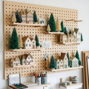 Attach small wooden shelves or pegs to a pegboard and arrange your village pieces however you like.