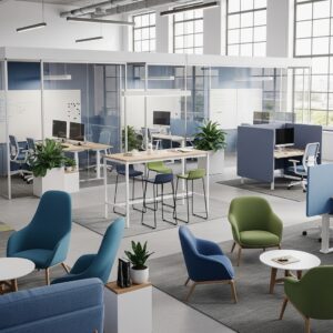 Flexible seating arrangements allow teams to reconfigure spaces depending on the project, promoting a dynamic work culture.