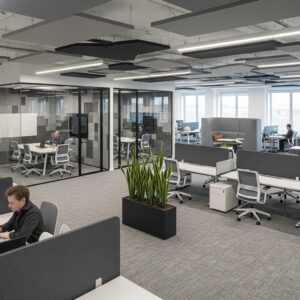 Acoustic panels, carpets, and soundproof meeting rooms minimize distractions and maintain privacy.
