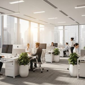 Pairing natural light with energy-efficient LED lighting helps maintain a bright, comfortable, and sustainable office environment.