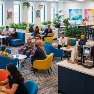 Breakout areas with comfortable seating, games, and coffee stations encourage relaxation and social interaction.