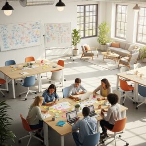 These zones can include large tables, whiteboards, and tech-enabled meeting spaces.
