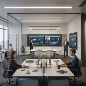 A well-designed corporate office balances functionality, aesthetics, and employee well-being.