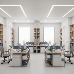 Linear layouts arrange desks, offices, and storage along straight lines, often following the shape of the building.