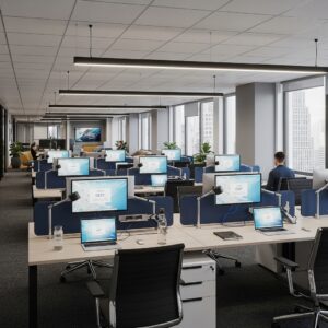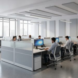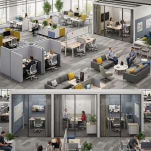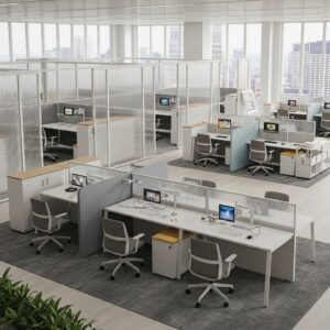Modern cubicle designs feature lower walls, sound-absorbing materials, and sleek finishes.