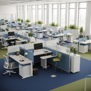 Today’s cubicle desks feature low partitions, sound-absorbing panels, and contemporary finishes.