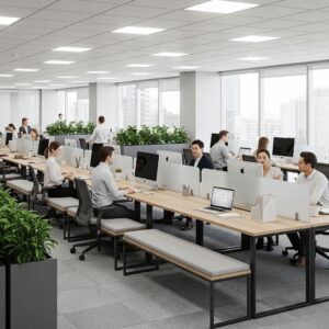 Bench desks work especially well for creative or project-based teams, and when paired with acoustic panels or desk dividers, they balance openness with focus.