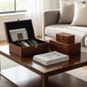 They work beautifully in living rooms, offices, and entryways for storing books, remote controls, important papers, or keepsakes.