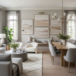 Hang artwork that complements both zones — perhaps a matching set of framed prints or one large piece stretching across the shared wall.
