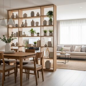 A long sideboard can store dining essentials while displaying decor visible from the living area.