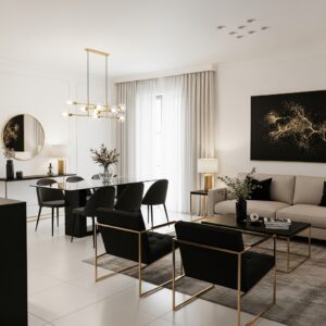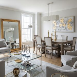 Use fewer but more refined pieces — a sleek dining set, plush sofa, a glass coffee table, and metallic accents.
