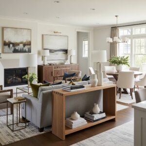 A console table behind the sofa can hold both a lamp and dinnerware — blending elegance with practicality.