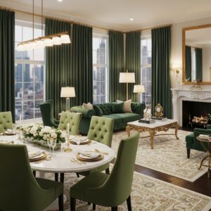 Mix textures like velvet sofas, linen chairs, and marble-topped dining tables.
