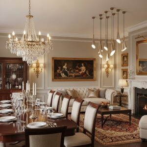 Hang a grand chandelier over the dining table and add elegant sconces or pendant lights near the living area.