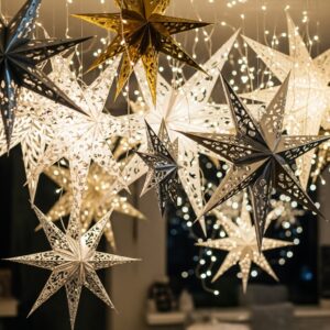 Cut stars from white or metallic paper and hang them at varying heights across the ceiling.