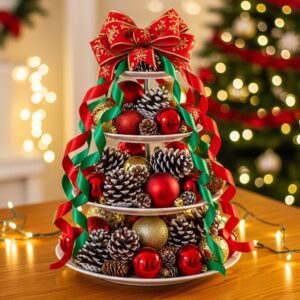 Stack Dollar Tree cake stands or trays into a tiered display and decorate each level with ornaments, pinecones, and ribbons.