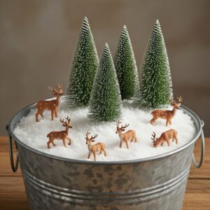 Grab a galvanized bucket from Dollar Tree, fill it with faux snow, and arrange mini Christmas trees, reindeer figurines, or ornaments inside.