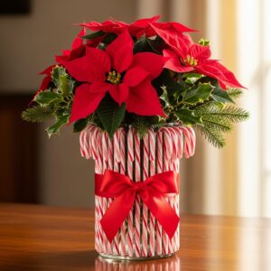 Hot glue candy canes around a glass vase, tie a ribbon around it, and fill it with fresh flowers or faux poinsettias.