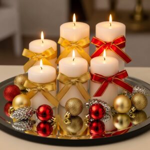 Take several pillar candles and wrap them with wide Dollar Tree ribbons in festive colors like red velvet, plaid, or gold.