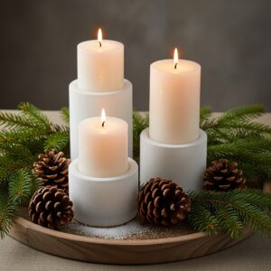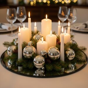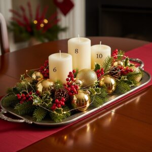 Use a decorative tray as the base, then layer candles, faux greenery garlands, berries, and ornaments for a quick yet stylish centerpiece.