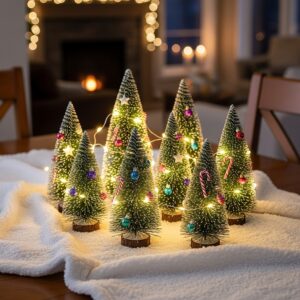 Place three or four in the center of your table, decorate them with tiny ornaments or fairy lights, and add a snow blanket underneath for a whimsical winter forest look.
