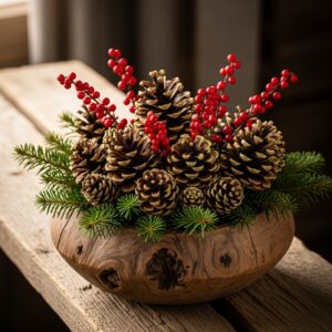 Fill a wooden or ceramic bowl from Dollar Tree with pinecones, faux berries, and greenery.