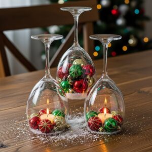 Turn Dollar Tree wine glasses upside down, place ornaments inside the bowl, and use the flat bottom as a candle stand.
