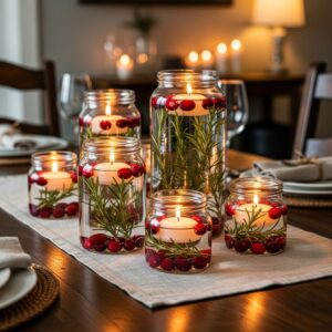 Fill clear glass jars with water, drop in cranberries and rosemary sprigs, and add a floating candle on top.