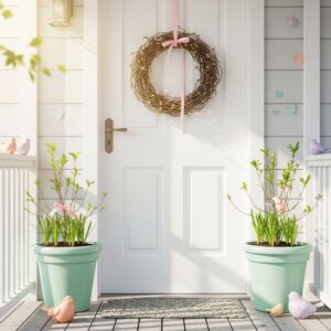 Introduce hints of pastel through small details—like a pale pink wreath ribbon, mint-green planters, or light blue cushions.