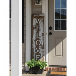 A vertical wooden welcome sign leaning beside your door adds charm without requiring much effort.