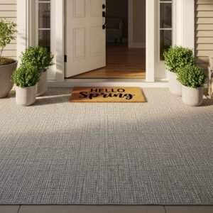 Start with a larger neutral outdoor rug (like buffalo check or a subtle stripe), then place a smaller “Hello Spring” mat on top.