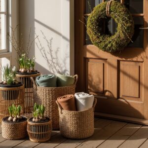 Incorporate natural elements like moss wreaths, woven baskets, or rattan planters.