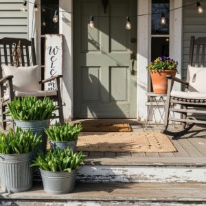 Galvanized buckets or metal planters filled with tulip bulbs create a charming farmhouse vibe.
