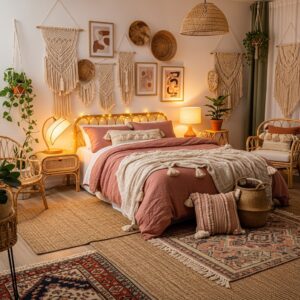 Incorporate bohemian elements like hanging macramé, layered rugs, and eclectic decor in earthy pink tones for a free-spirited vibe.