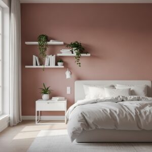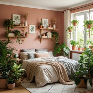 Earthy pink walls paired with green plants create a refreshing, nature-inspired bedroom aesthetic.