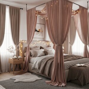 A canopy bed draped in earthy pink fabric creates a romantic and dreamy bedroom space.