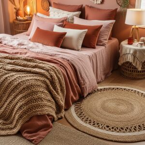 Mixing textures like linen, velvet, and jute adds depth to an earthy pink bedroom, making it feel inviting and tactile.