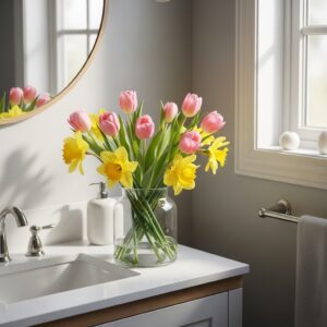Position them on the vanity, toilet tank, or windowsill to instantly brighten the room and add a natural spring scent if using real flowers.
