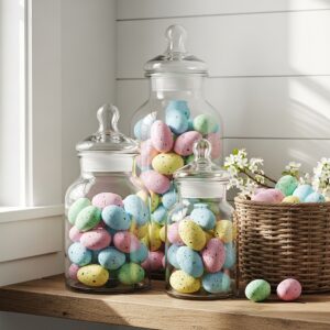 Fill clear apothecary jars with decorative Easter eggs in soft pastel tones.