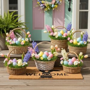 Filled with faux grass, eggs, or florals, they create a layered, festive look that ties the entire porch together beautifully.