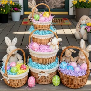 Stacked Easter baskets filled with grass, pastel eggs, and plush bunnies create an adorable focal point.