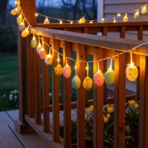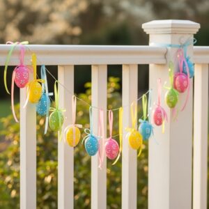 Decorate your porch railing with string lights and hang small Easter-themed charms like eggs, chicks, or flowers.