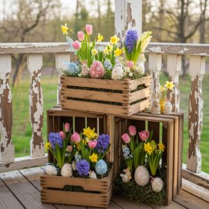 Stack wooden crates to create a layered display. Fill them with flowers, Easter eggs, or small bunny figurines for a rustic spring charm.